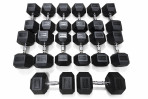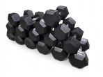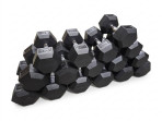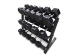 Hantelių ir stovo derinys: Apima 385 kg šešiakampių svarmenų rinkinį ir 3 lentynų stovą.