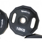 Aštuonkampė forma su integruotomis rankenomis leidžia patogiai ir saugiai naudoti plokštes ne tik ant štangos, bet ir atliekant atskirus pratimus – įtūpstus, spaudimus ar „core“ treniruotes. Ši forma taip pat padeda išvengti nepageidaujamo plokščių riedėjimo treniruočių erdvėje.