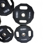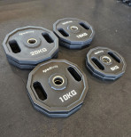 Plokštės pagamintos iš aukštos kokybės CPU (Cast Polyurethane) medžiagos, pasižyminčios dideliu atsparumu dilimui, smūgiams ir ilgaamžiškumu net ir intensyvaus komercinio naudojimo metu. Integruotas plieninis žiedas užtikrina sklandų ir tikslų uždėjimą ant visų 50 mm olimpinių štangų bei ilgą tarnavimo laiką.